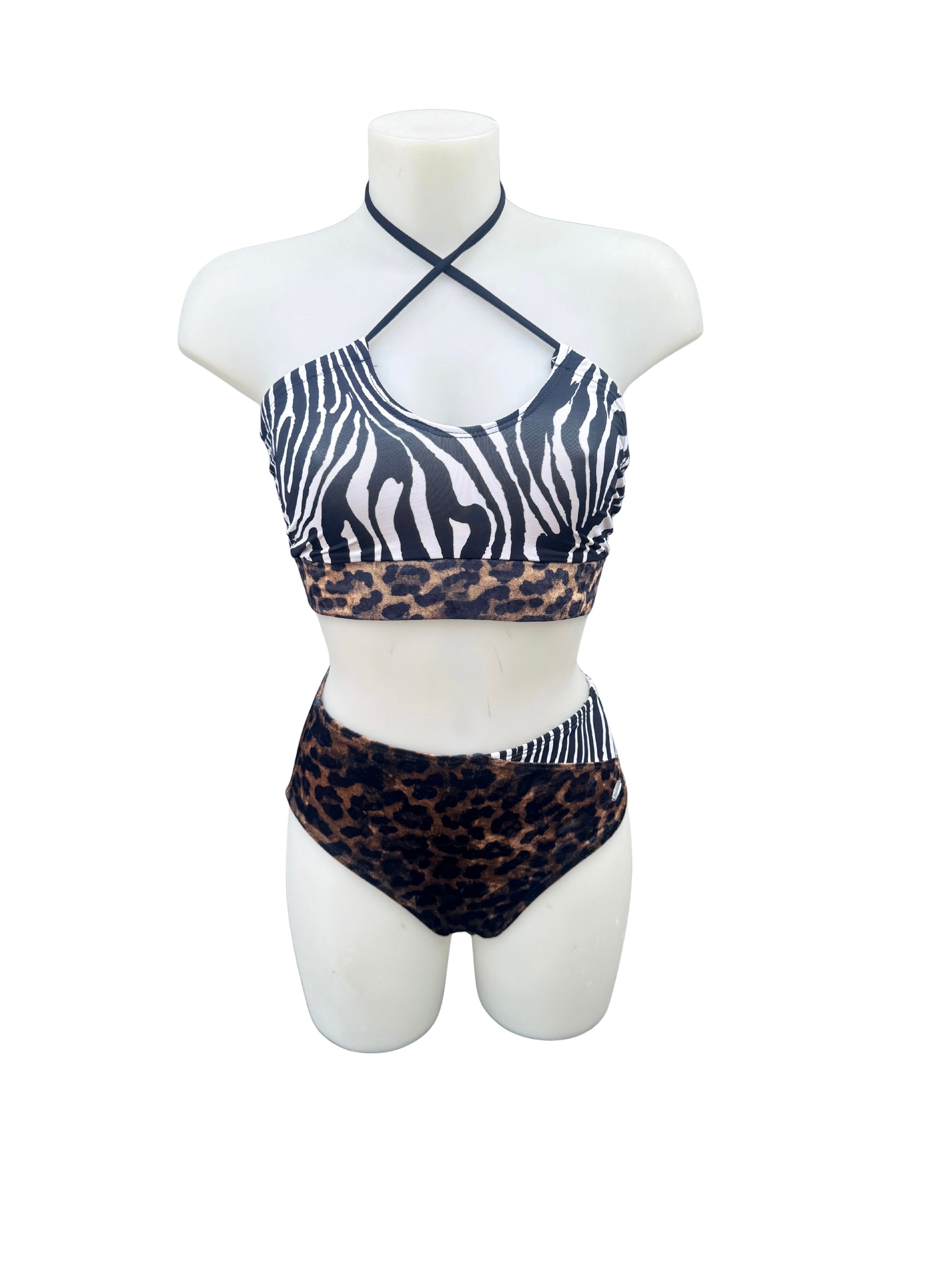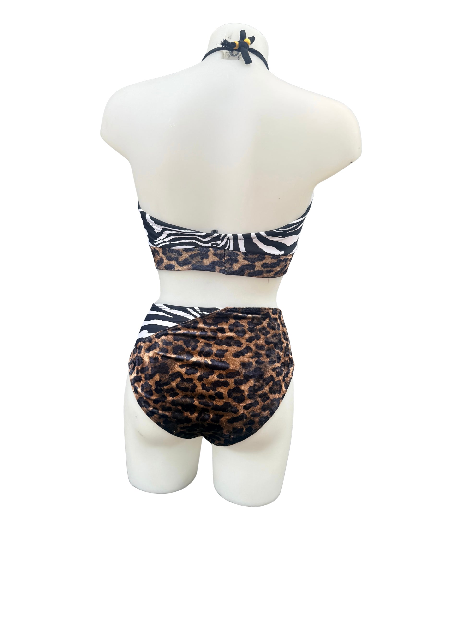 Bikini de diseño exclusivo que combina licra cebra en el top con tiras cruzadas y terciopelo leopardo en la braguita de tiro alto. Un contraste de texturas que aporta comodidad, estilo y un acabado súper favorecedor.
