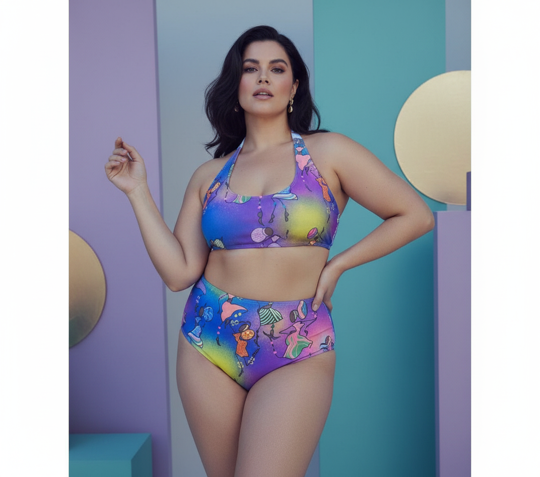 Bikini , estampado con la colección Kisasha .Braga alta,parte alta estilo camisulla con cinta anudada al cuello.
